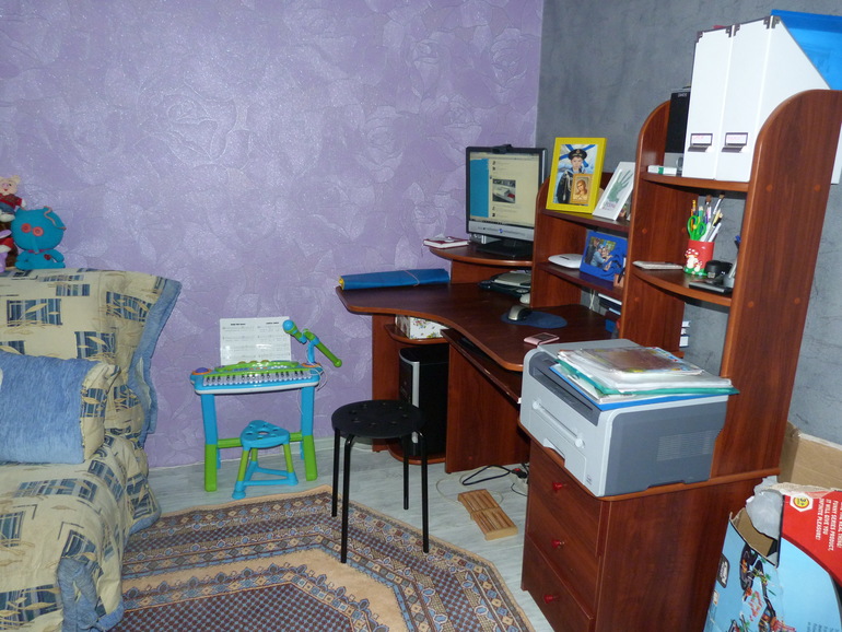 Далее выходим и идем в комнату!!! Сейчас здесь стоит компьютерный стол, на месте которого будет стоять детская кроватка..На этом диване (разложенном спит Арсений). Вид из окна тот же, что и из зала- во двор, на детский сад "Умка" и торговый центр.