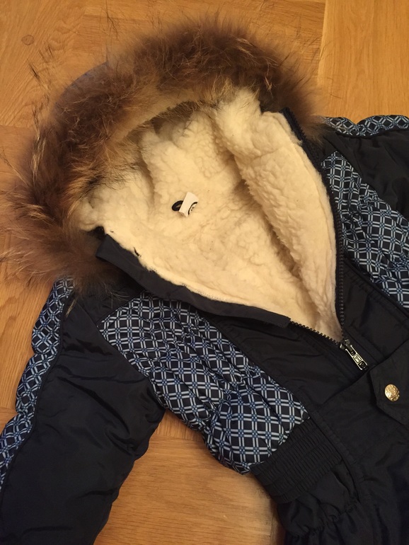 Комбинезон в отличном состоянии, носили только в коляске и очень мало, так как были еще другие. Очень теплый!!!! Внутри овчинка, на капюшоне енот.