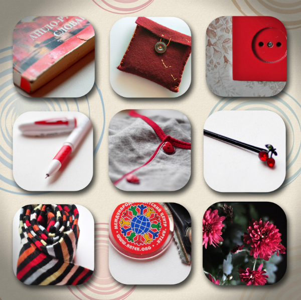 Мой красный, как оказалось, вокргу меня окружает:) Я то думала,что не смогу найти и трех вещей. А тут и мой "потрепанный жизнью" словарик, и чехольчик для телефона, и вот эти розетки, котоыре не везде поменяли по квартире ещё с получения её, и ручка, которой пишу в дневниках, и любимая пижамка с пуговичками, и заколочка-вишенки, и в шарфике, котоырй уже доастала оказался красный цвет, а ещё на брелке ключах, котоырй очень дорог и хризантемки в подарок на подоконнике:)