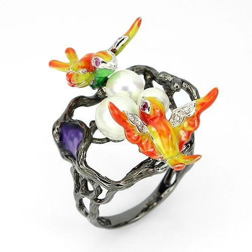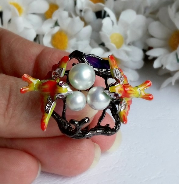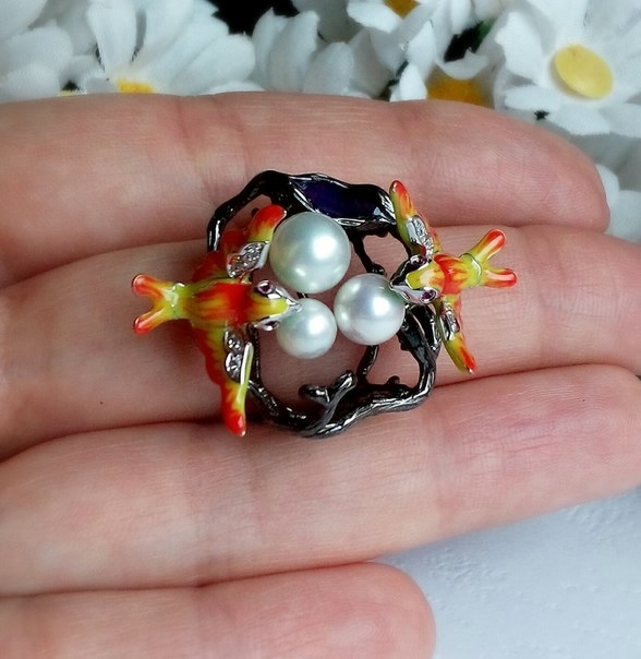 Птички их серебра 925 пробы, с покрытием белого золота 14К, инкрустация цирконием. Натуральный жемчуг на эпоксидной смоле.