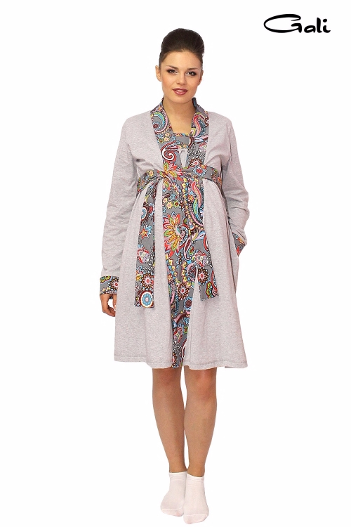 Самый удобный и практичный набор для будущей мамы - платье на широких бретелях с удобным и абсолютно незаметным секретом для кормления, и халат с длинным рукавом на запахе. Приятная цветовая гамма, натуральная ткань и продуманный крой - создадут комфорт и уют будущей маме, не сковывая движений.
