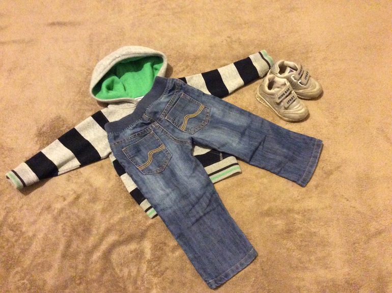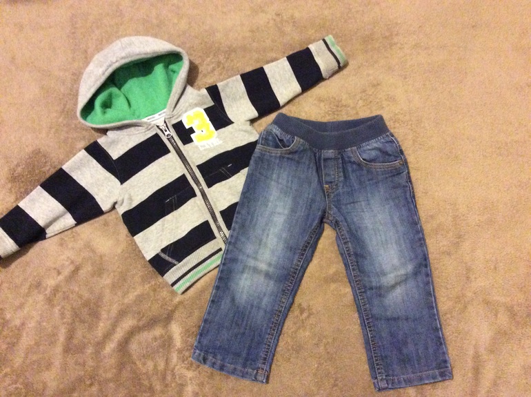 Толстовка marks&spencer ( написано на 1-1,5, но мы носили в 1,5-2 годика), носили активно, но отразилось это только на буковке потертой. 250руб