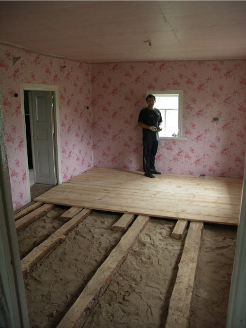 Мы вдвоем разложили по песчаному полу подмостки (они же лаги) - эти толстенные огроменые брусья, померяли их уровнем, подправили, выровняли...