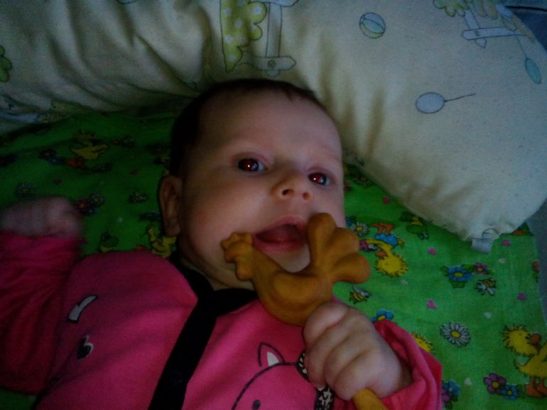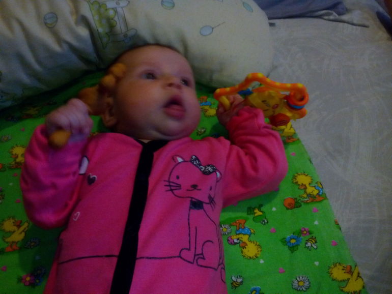 Волосатик какой:) умничка девочка! Наш маська тоже на днях держал и облизывал погремуху, правда, пока я ему её в ручку вкладываю. Так интересно наблюдать за ними)