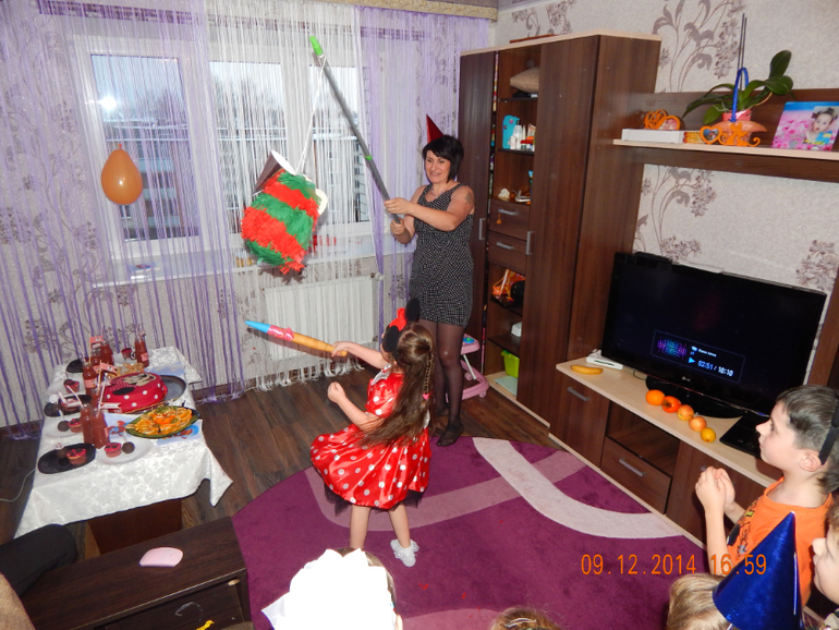 Конкурс когда именинница разбивает (сама делала)пиньята......... и летит конфетти....конфеты....и она довольна что у неё получилось,(хоть и с помощью братика)видимо ей не хотелось ломать мамино произвидение.. смотрите...