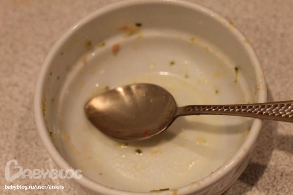 моя конечно)) правда, полтарелки)) варю кур бульон, курицу отдельно проворачиваю (кусками она не любит), потом пассирую лук и морковку, в бульон кидаю мелко нарезанную картошку, мин через 10 лук с морковью и варю еще мин 20. курицу провернутую кладу прям в тарелку перед подачей. Это самый простой суп)) еще любим куриный с вермишелью (та жа песня, кроме картошки вермишель), с фрикадельками... может иногда съесть борщ... но редко. Овощные супы раньше много ели, а щас че то ни ахти... Почти и не варю