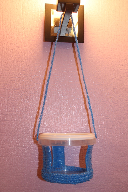 И ее я тоже связала обвязала. Наша учительница не любит тяжелые деревянные, говорит, ветки не выдержат. А вешают их на пару деревьев, выглядят они смешно- все утыканные кормушками, штук по 8 на каждом.
