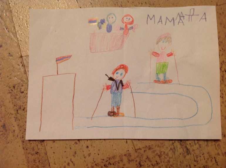 В нашей семье все любят смотреть биатлон! Это просто какая то зимняя страсть) отменяются все дела и встречи, все садятся перед телеком, болеют) свекр вообще фанат - всех и про всех знает) вобщем, Лада в теме. Недавние просмотры не прошли мимо нее. Вот такой рисунок принесла вчера из сада. Меня даже как то гордость забирает, она с таким жаром рассказывает что наш впереди а мы с мамой на трибуне и кричим "Россия вперед!" И машем флагом))) наверое в группе ее не особо поняли))) но мне очень приятно!!
