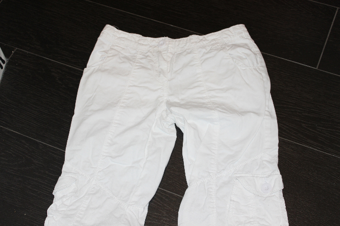 Белоснежные летние брюки 100% хлопок. В идеальном состоянии, возможно даже и не носили, уже не помню, может одевали 1 раз. Размер стоит 14А, 156 см. Спереди 2 кармана, сзади 2 накладных кармана застегиваются на пуговицы, сбоку на штанинах в районе колен 2 кармана, тоже застегиваются на пуговицы так же как и сзади. Внизу присборены на резинку. Есть запасные пуговицы. Цена 350 руб.