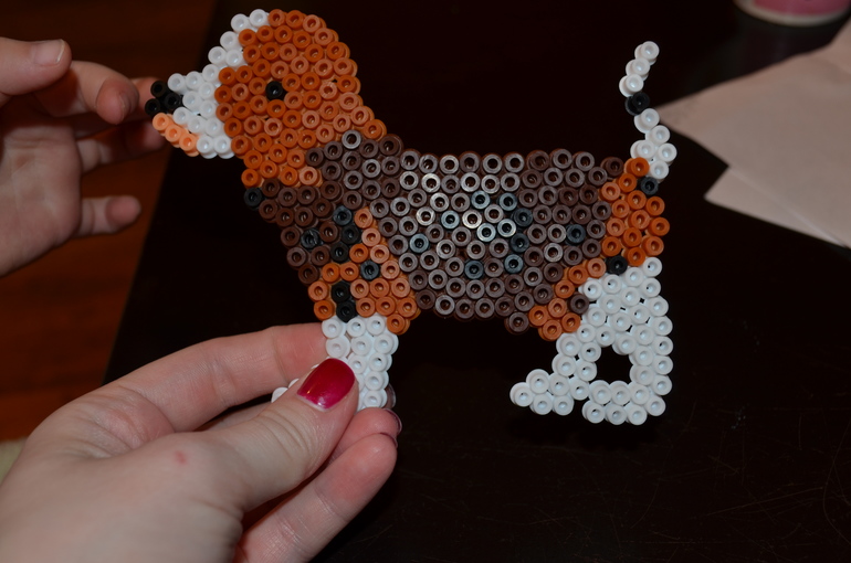 ребенок нанизывает мозаику, ты ее через листик проглаживаешь утюгом и кладешь под пресс на 5 мин. И потом это все слипается и можно снять и играть уже игрушкой.