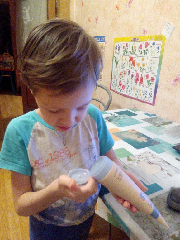 Ребенок тоже протестировал крем. Сначала начал нюхать, потом решил намазаться, но я его остановила. Сначало немного крема нанесли на сгиб руки. Через сутки никакой некативной реакции не было. И сыночек намазал себе ручки.