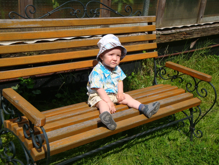 А вот наша любимая, очень удобная кованая лавочка....много лет она нас радует ......фото с моим сыночком :)