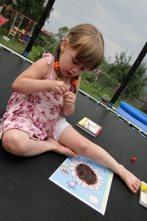 Свое знакомство с подсолнухом мы начали со сказки о том, как появляется подсолнух. Иришка слушала внимательно и что самое интересное - запомнила, не все конечно, но многое) Уже не первый раз убеждаюсь, что со сказками занятие проходит намного интересней и продуктивнее. За что и очень люблю ФМ Оксаны. Затем мы решили поиграть в игру, заполняли подсолнух семечками (Ирен конечно же выиграла, чему была несказанно рада))).