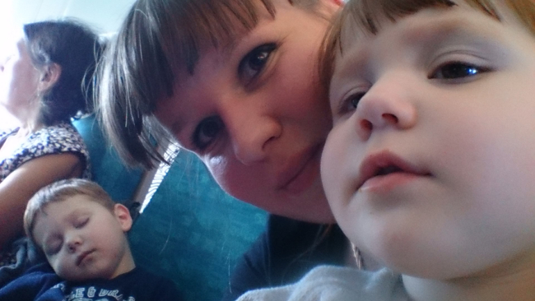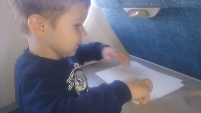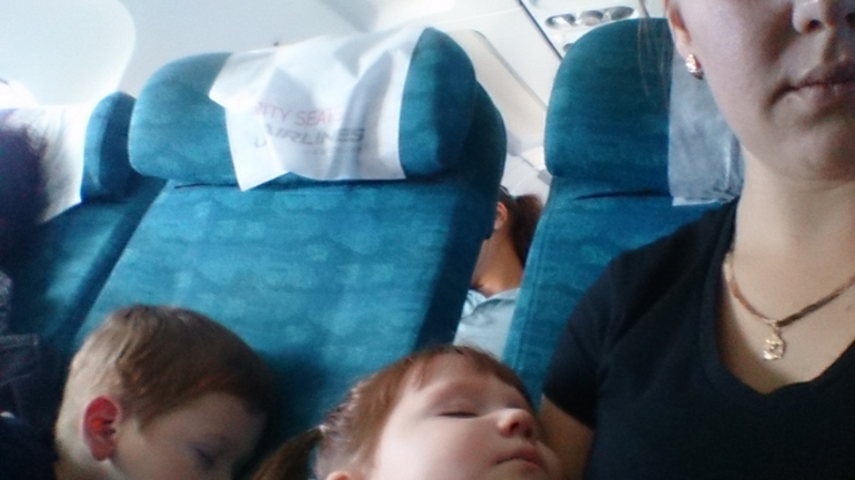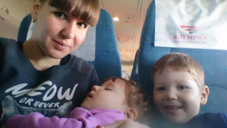 Я ожидала,что все будет ужасно, дети вынесут мозг и все в этом роде,но все прошло замечательно, не смотря на то,что второй рейс задержали на 2 часа. Первый перелет был всего 1,5 час с Ульяновска до Москвы. Вылетали утром, все время в пути спала Алина.. С Вадимом сидели рисовали,читали и играли. Аля спала на руке. В аэропорту между рейсами должно было быть 2 часа у нас,но наш рейс задержали и пришлось сидеть в зале ожидания..Хорошо,что багаж брать не надо было. Тут нас спасал планшет с Машей и медведем и шоколад Аленка )) А за 10 минут до посадки дети вырубили на мне.. я была немного напряжена,но пришлось будить их, деваться некуда. как только взлетели, Вадим уснул и проспал 3,5 часа. Полет 4 часа. С Алиной играли,ели, фоткались, рисовали,смотрели мульты и еще что-то.. Алина уснула за полчаса до прилета, а Вадя проснулся.. КАЙФ, во время обоих перелетов один ребенок спал, а развлекать одного куда проще.. все прошло прекрасно,папа нас встретил,дети в него вцепились и отпускать не хотели.. )) Ну и фото
