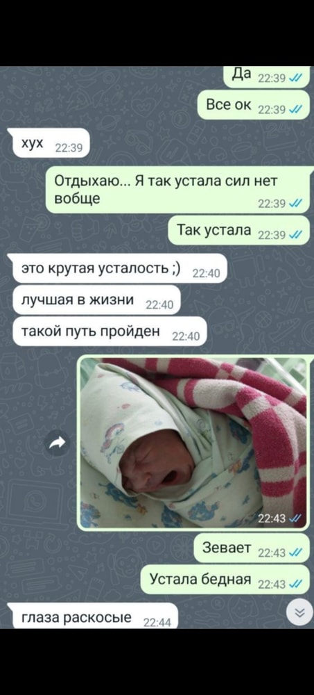 Мне подключили ктг и от этого было совсем плохо, хотелось просто чтоб это скорее закончилось, я не могла думать ни о чем прекрасном на что настраивала себя, ведь я шла на роды как на праздник, как на день рождения.... Но не могла даже дышать правильно. Врач была особо безучастна, и я ожидала другого отношения конечно, но да ладно, в 21.00 я уже родила с 3 потуг. И написала мужу. Его реакция 🤣 он просто думал я шучу и шлю фотки чужого запеленаного ребёнка 😅 он никак не мог поверить, что первый раз мы рожали вдвоём больше суток, а тут он меня высадил 2 часа назад я уже и родила, и фото шлю 🤣