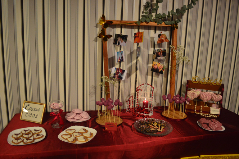 Я оформляла кендибар, пекла сладости, придумывала дизайн всего, занималась оформлением столов гостей, закупала ткани на банты на стулья, искала яблоки в цвете марсала по всем рынками страны, искала флориста с приемлемыми ценами, оформляла президиум (стол молодых и фон сзади)