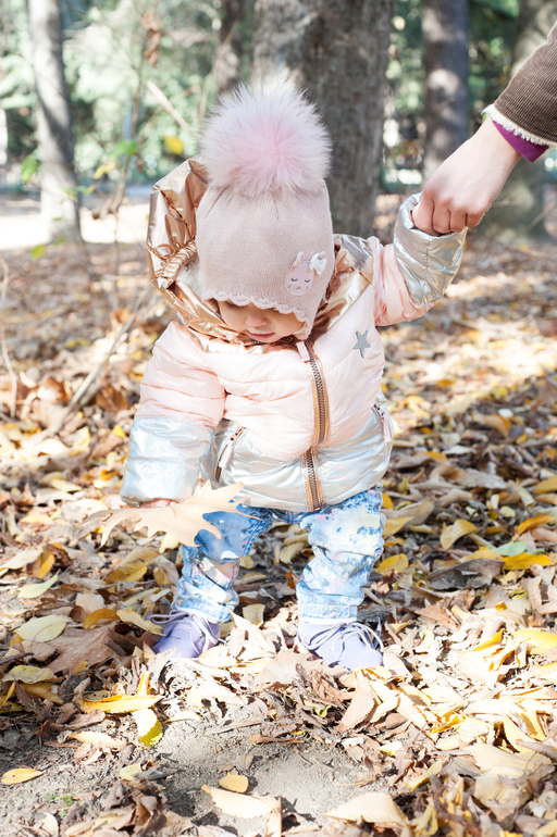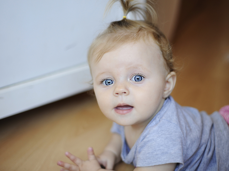 Пока только реактивно ползает и бегает у опоры или за руки. Сам даже не пытается, сразу садится на попу.
