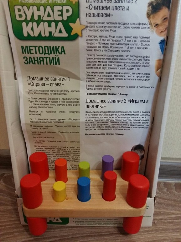 Игрушка сделана из дерева, очень добротно. Некоторые гвозди ходят свободно, некоторые - с натягом (но надеюсь, ход можно будет разработать). Вместе c игрушкой поставляется пособие, как правильно занять ребенка данной игрушкой. Очень интересно и познавательно. В данном пособие представлено две игры, в одну из которых, мы даже успели сыграть.