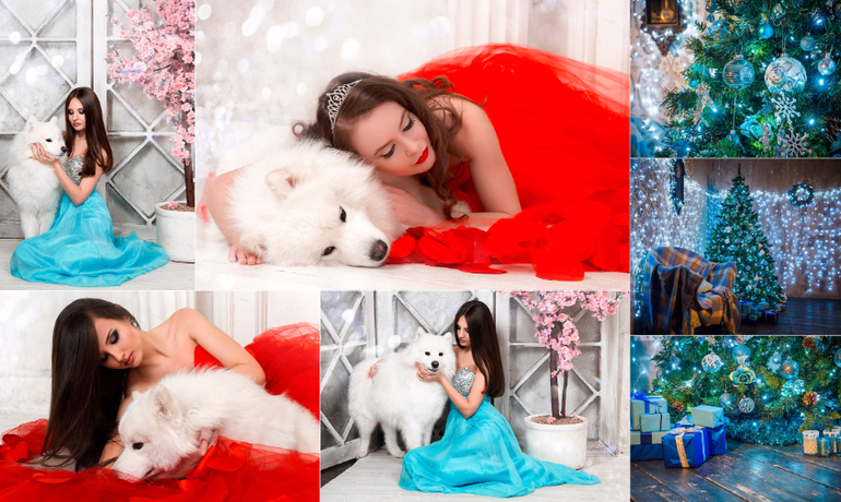 Фантастические бальные платье, белые шубки, новогодняя декорированная студия и самая добрая на свете собачка породы самоед!