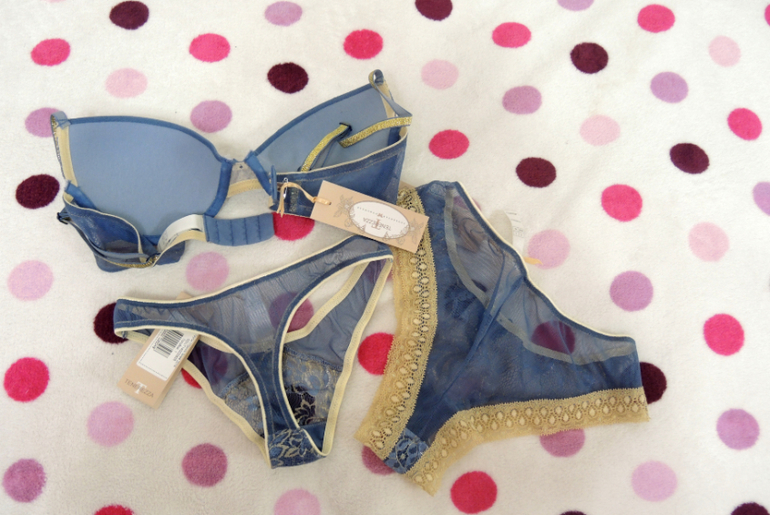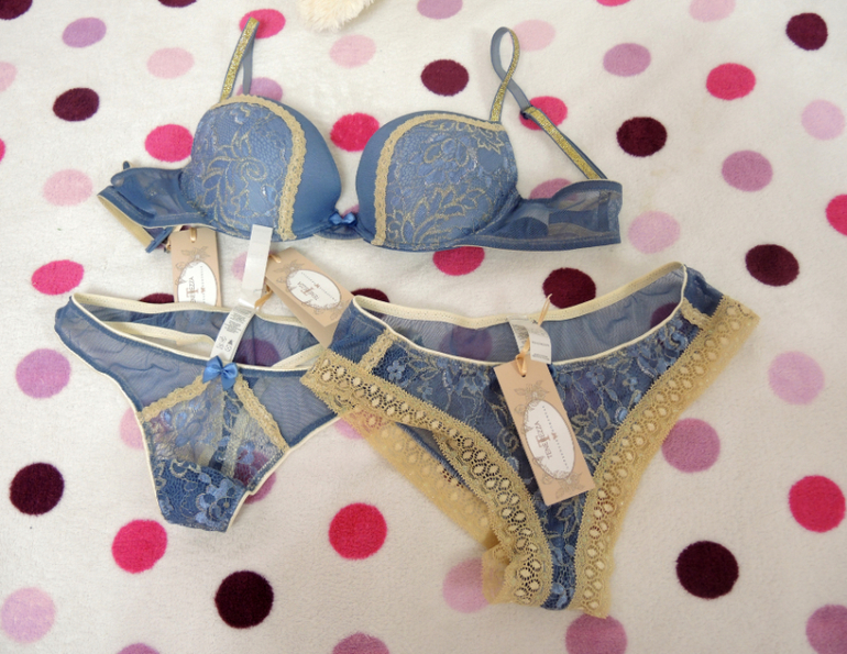 Комплект очень красивый, голубого цвета с золотистой отделкой, но белье, к сожалению, возврату не подлежит.
