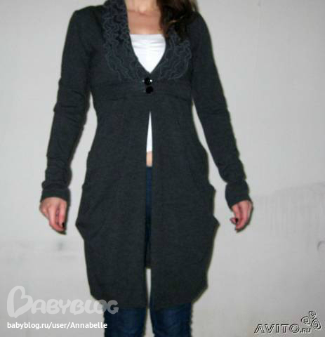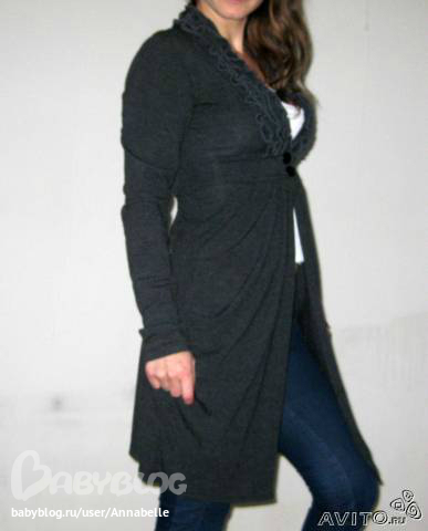 Продаю практически новый кардиган, серый цвет, ткань – нежная тонкая шерсть. Оборки, поясок сзади. Очень женственная и красивая модель. Длина чуть выше колена. Пуговички под грудью, складочки по бокам. На размер от 42-46 хорошо пойдет.