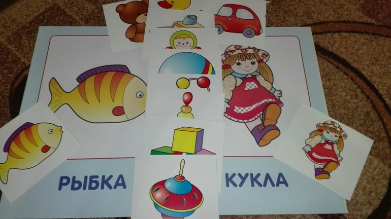 Суть книги в том чтобы ребенок изучил картинки на которых изображены различные детские игрушки и потом мог их показывать. Также предлагается вкладыш из которого можно вырезать карточки с изображением этих же игрушек только в уменьшено виде. Ребенку предлагается смотря на большую картинку найти такую же маленькую.