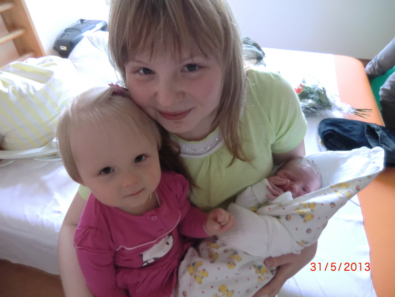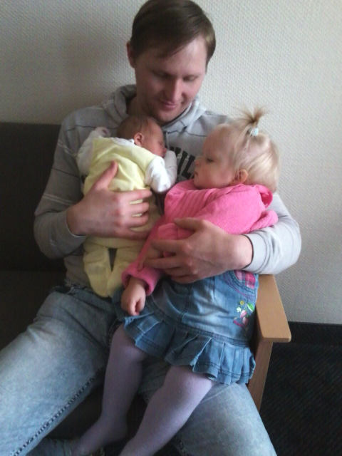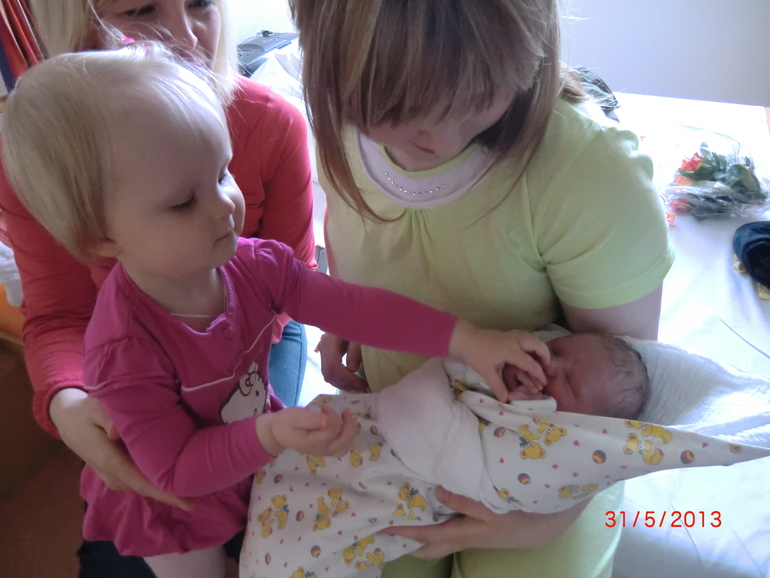 Она была страшненькой! Худенькая, длинная, как лягушонок:) И волосы. Я подозревала, что грёбанная изжога во время беременности зделала своё дело:) Как и пять лет назад у мужа ночная смена)) Он с ночи тут же ко мне в больницу поехал. И продержался до часу дня)) Потом он уехал отсыпаться, а ко мне пришли родители с Мелиссой. Вот первое фото первой встеречи сестричек: