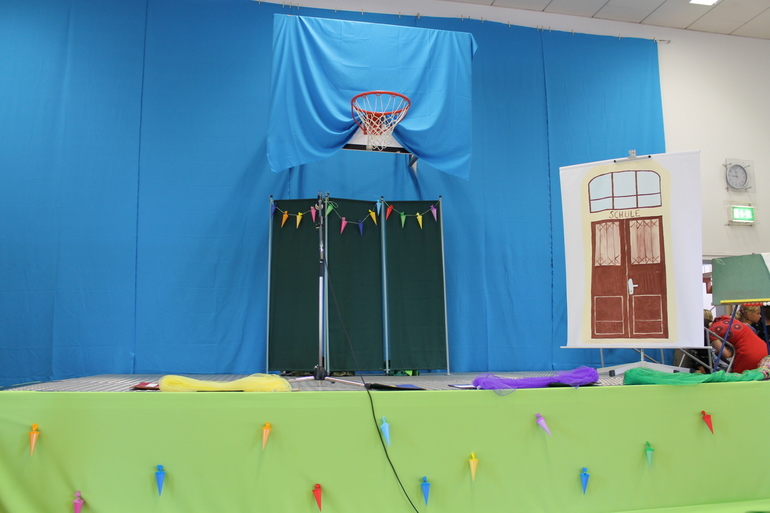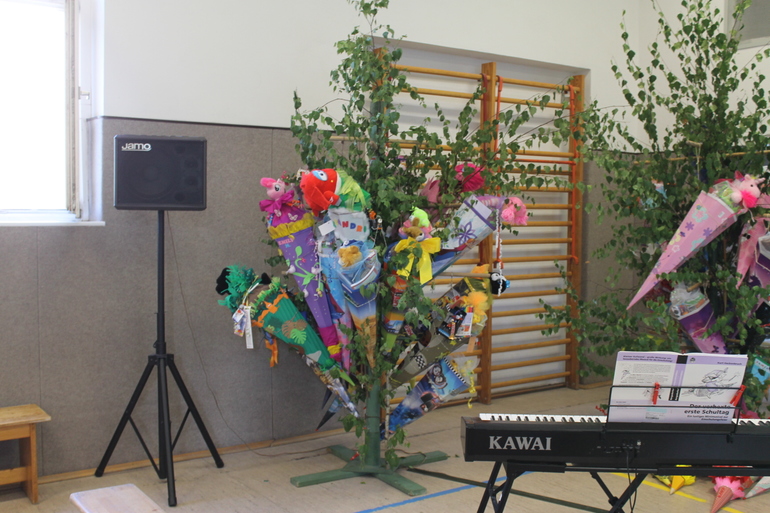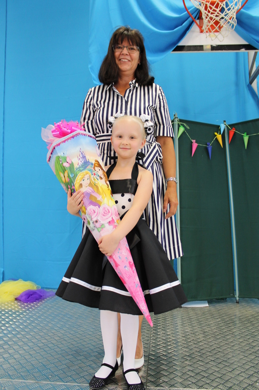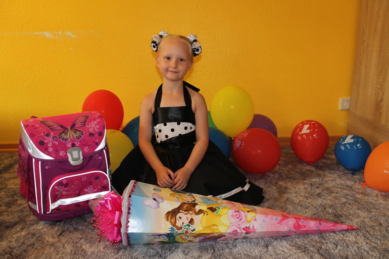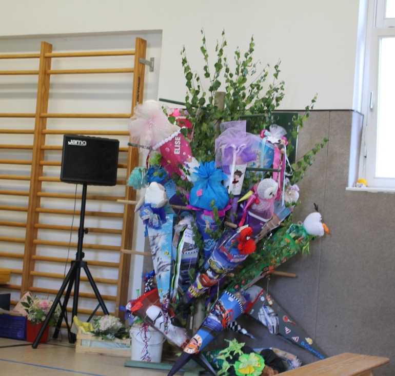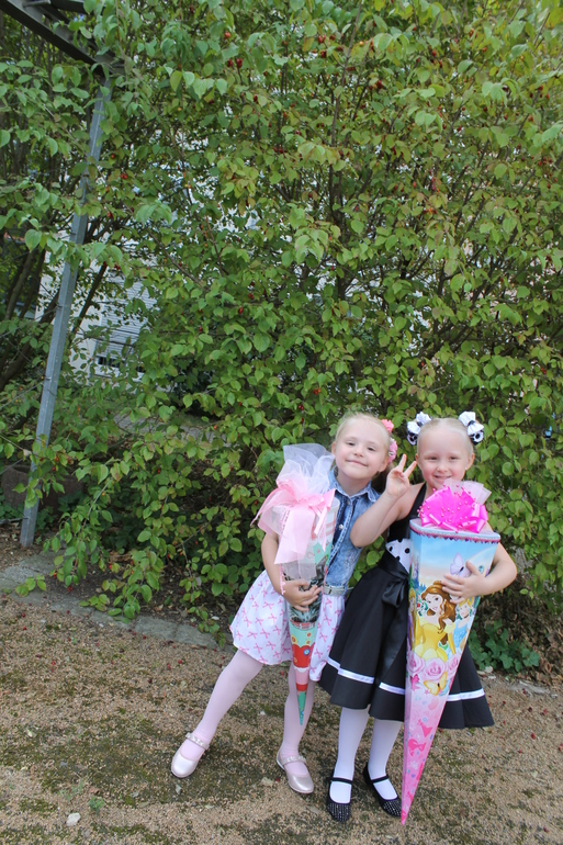 День 11 августа начался рано, но удачно. С причёской моей первоклашки я возилась 40 минут! Пыхтели вместе с мужем над её волосами)) И на удивление она ни разу ни пискнула, наверное всё же подействовало чувство предвкушения)) В школу мы приехали самые последние, ну у нас никогда по другому не бывает. Детей возле школы встречала учительница, когда с нашим приходом весь класс собрался детей повели знакомится со школой и классной комнатой, а родителей отправили ждать в спортзал. В спортзале уже нас ждала деректрисса и три Zuckertütenbaum.