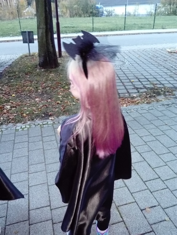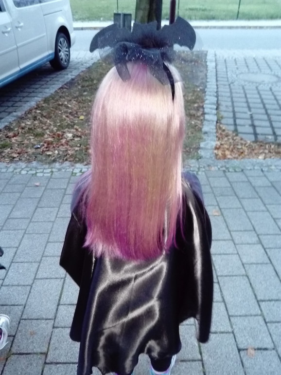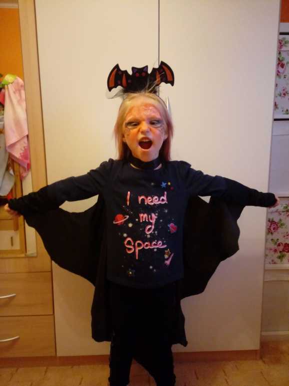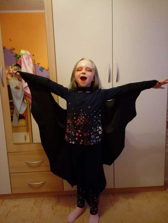 И так я заранее запаслась для Мириам смывающейся краской, а для Мелиссы чёрным окрашивающим лаком для волос. Прикупила и крылья летучей мыши. У них в этом году культ летучих мышей))