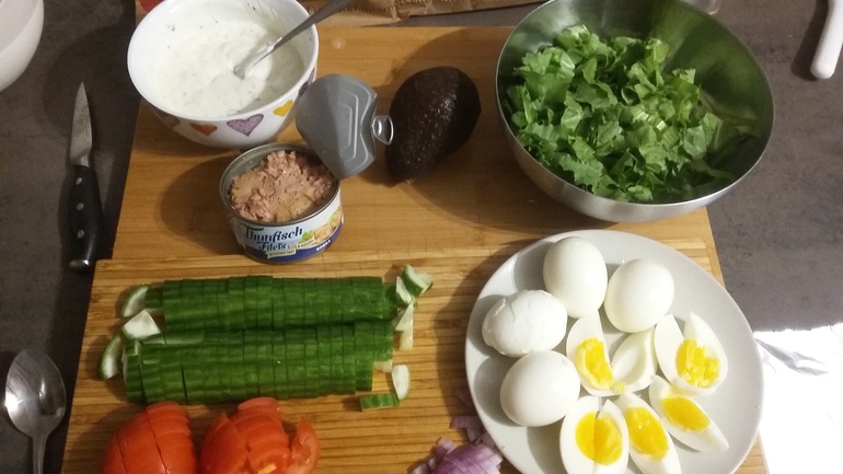 Соус: йогурт, зелень, горчица, рассол тунца.