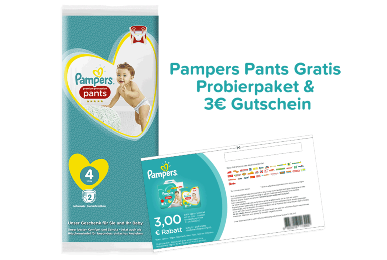 Unsere Hӧschenwindeln Pampers Pants lassen sich ganz einfach An- und Ausziehen, auch wenn Ihr Baby sich bewegt, und sie halten bis zu 12 Stunden trocken. Bestellen Sie jetzt Ihre Gratisprobe, die 2 Pampers Premium Protection Pants in Grӧsse 4 enthält und einen 3€ Rabatt-Code für Ihren nächsten Pampers Pants Einkauf. Sie erhalten das Probierpaket innerhalb der nächsten 4-6 Wochen an die von Ihnen angegebene Adresse.