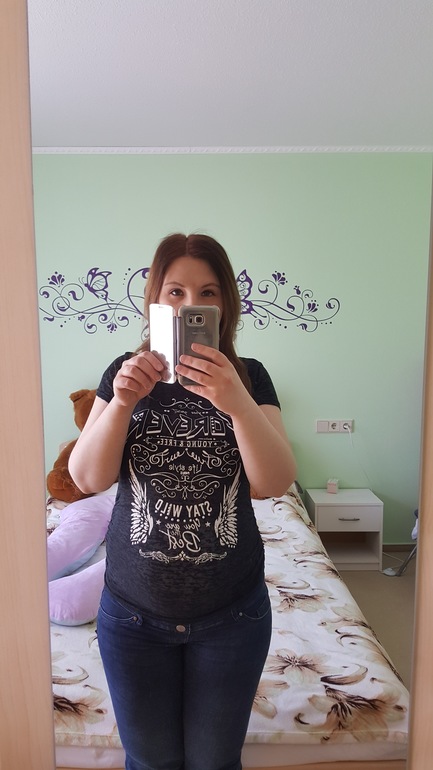 Сегодня радости не было предела, когда мне всё ещё подошла добеременная футболка)) Значит я пока не поплыла, хотя живот мне кажется очень уже большим.