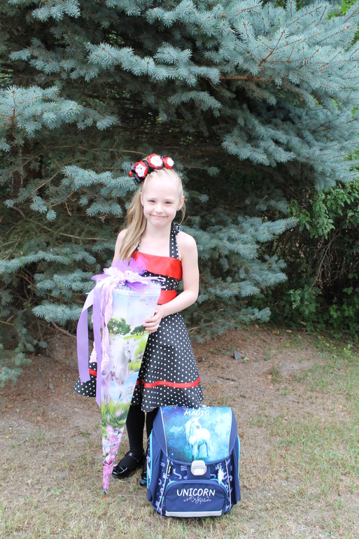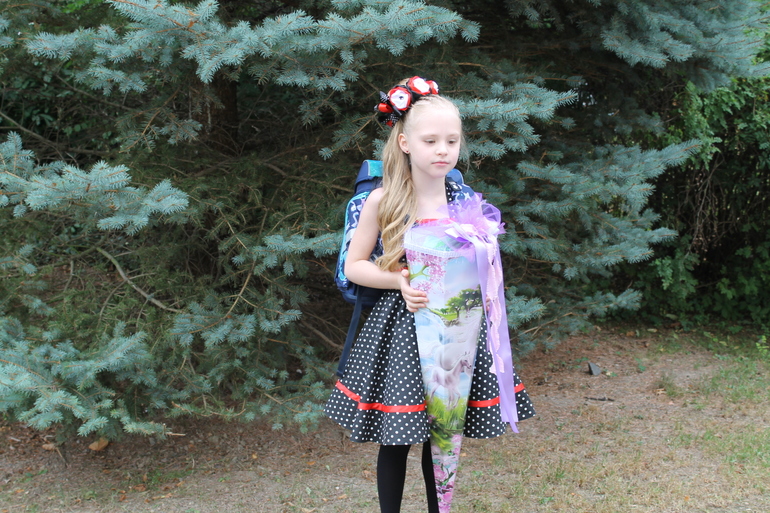 Торжество было назначено на 9 утра 29.08.2020, проводилось в спортивном зале. Встречала учительница перед школой в 8:50. 3 и 4 классы подготовили небольшую сценку, директриса толкнула свою очередную скучную речь под которую можно было уснуть. И вот тот момент! Вручение кулька. Мириам, как и Мелисса, так же первая в списке и вышла первой:
