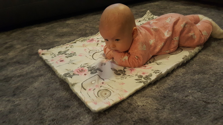 Лёжа животе голову хорошо держит, но руки пока ещё разъезжаются 😄