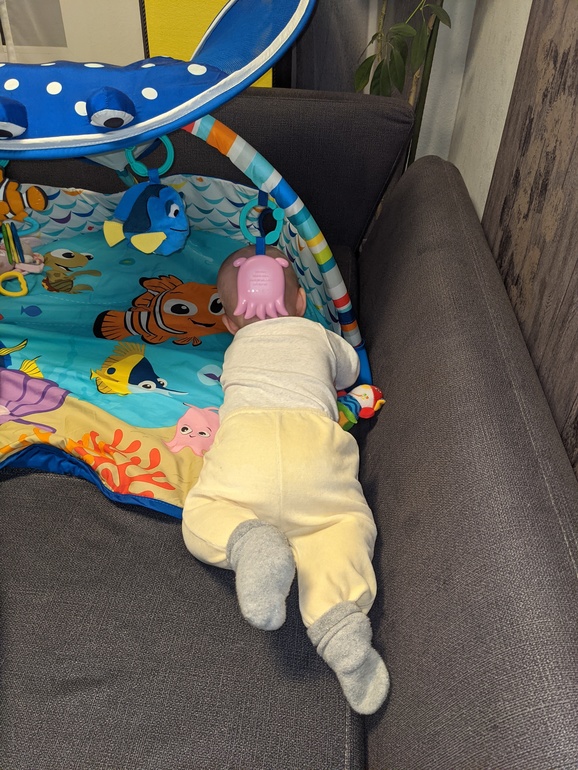 За день до 5 месяцев самостоятельно перевернулась со спины на живот, когда лежала под игрушками на развивающем коврике: