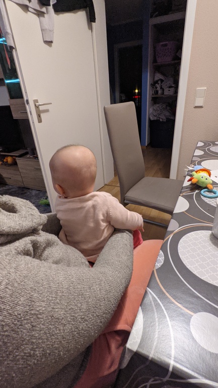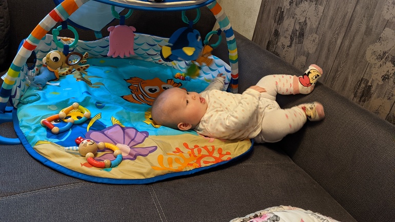 За ручки подтягивается и садится. Стала больше крутиться и меньше улыбаться. Улыбки только тогда, когда снимается памперс. Любит когда ей животик целуют и шею. Утром когда просыпается и я к ней подхожу - то сияет и смущается 😁