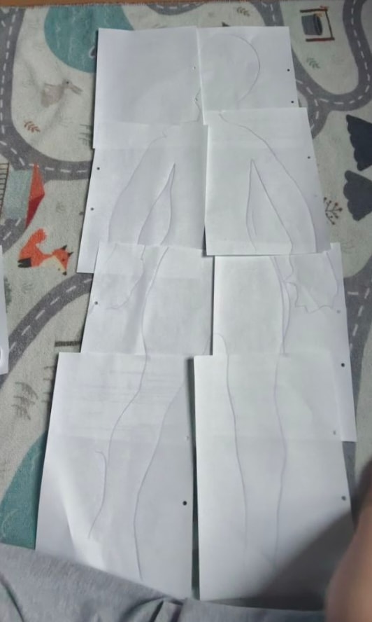 4. Обводить что-нибудь по контуру. Хиты - попа, голова и игрушки. Очень терпеливо лежит, потом смотрит, что получилось.