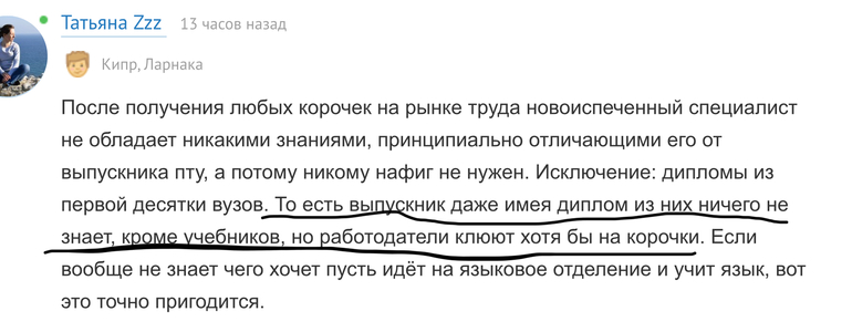 Нет в моих сообщениях ни слова про то что учиться не нужно. Есть сообщение про то что все выпускники одинаково бесполезны оторваны от реальности, но дипломы некоторых вузов всё же лучше других. Если вам этот факт не нравится - это ваши личные проблемы или какие-то комплексы. А если вам мой тон не нравится - так я вам уже и намекала несколько раз, а теперь так и прямо говорю - хорош уже мне написывать, идите лучше делами займитесь 😁