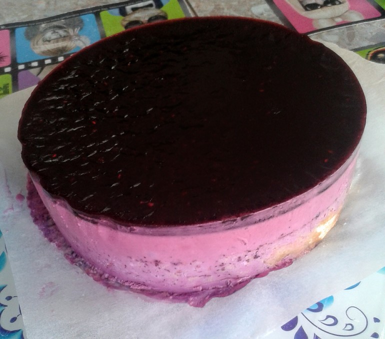 У меня есть специальная пленка для муссов, поэтому я форму прокладываю ей. В форму кладем бисквит, сверху наливаем йогуртовую часть и отправляем в морозилку. У меня стоял часа два прежде, чем я сверху налила желейную часть.
