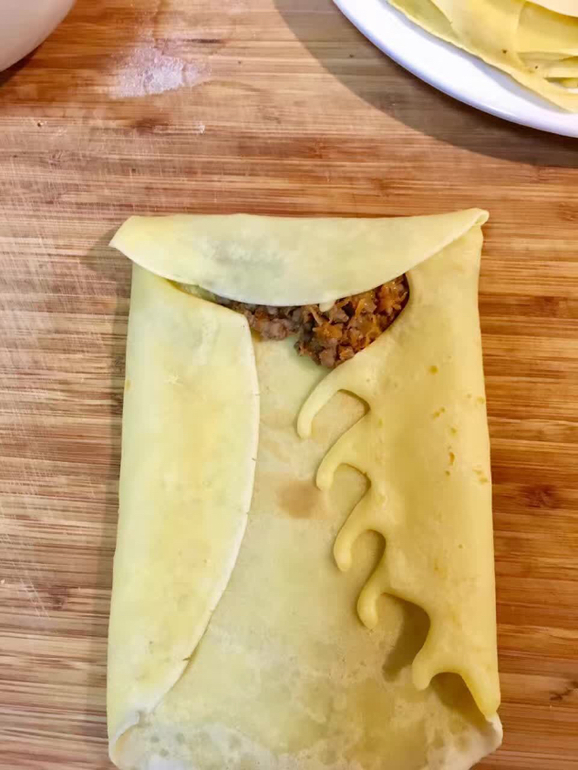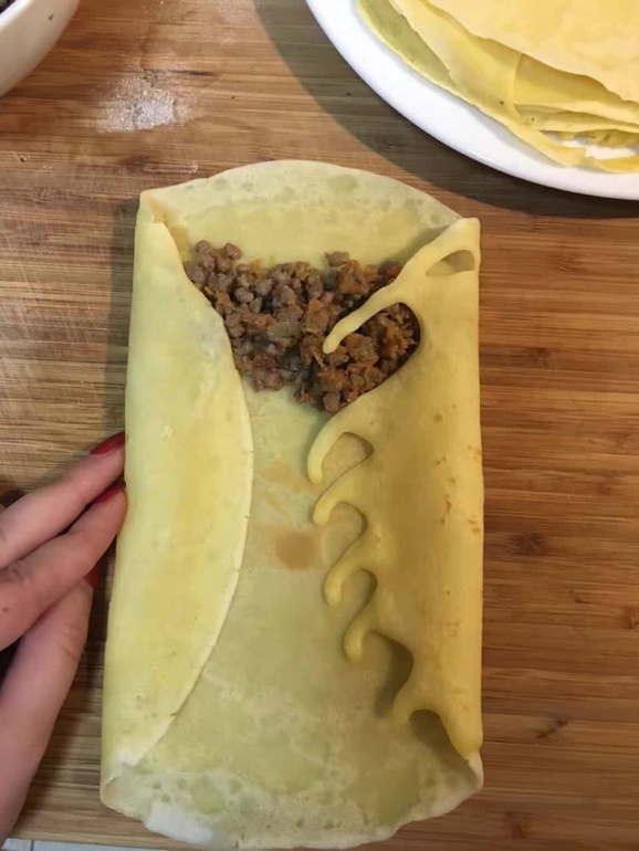 Этим рецептом со мной поделилась одна добрая хозяйственная женщина. Раньше фаршированные блины совсем не получались, или рвались ещё при заворачивании, или на полпути из сковороды в тарелку. А теперь получаются все ровненькие, красивые и одинаковые. Тесто хорошее и быстрое, и лишних телодвижений делать не надо. Кста, такой метод заворачивания я использую, когда делаю спрингроллы вьетнамские или тайские-все чудесно держится. Делюсь