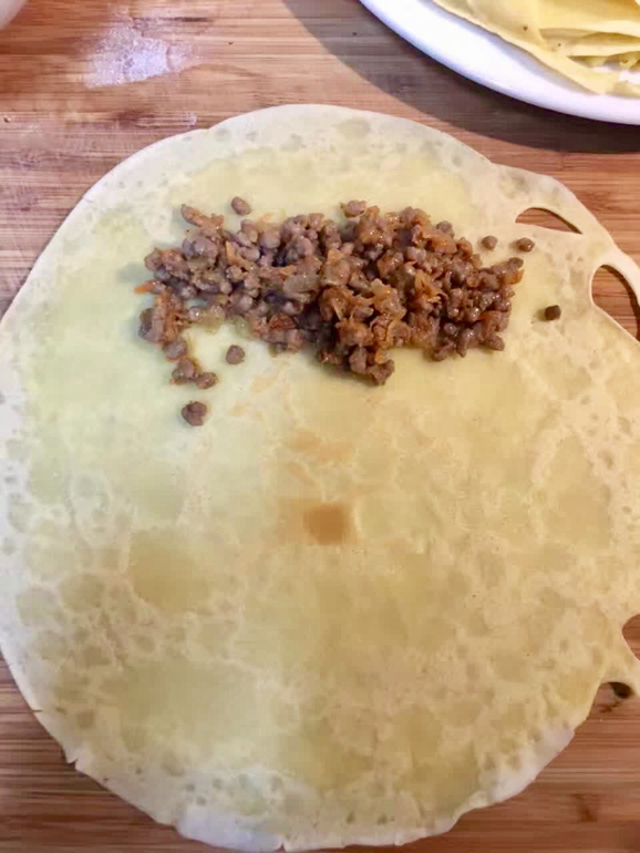Я делала в этот раз с говяжьим фаршем, луком и морковкой. Если немного заморочиться и отварить говядину с лавровым, солью и перцем, перемолоть ее в мясорубке и добавить немного бульона для сочности, то по вкусу получатся такие же блины, как раньше подавали в совецких столовках, вкус помню из детства (о, мадонна, какая я древняя...дада)