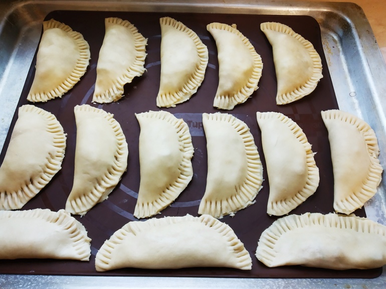 Защипываем края и придавливаем их вилкой по шву. Кладем пирожки на противень и смазываем их взбитым яйцом.