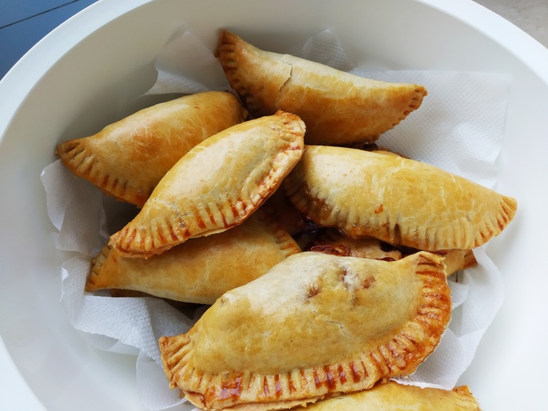 Вынимаем тесто из холодильника, раскатываем в пласт толщиной 3 мм и вырезаем выемкой круги (диаметр около 11-12 см). На каждый круг кладем начинку.