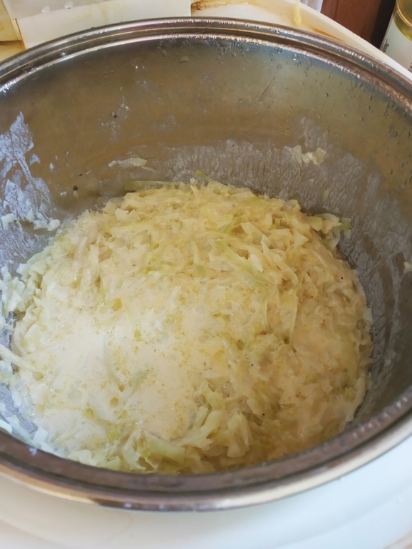 Для приготовления начинки в чаше мультиварке на смеси растительного и сливочного масла пассеровать 1 мелконарезанную луковицу до мягкости, иногда перемешивая, затем добавить нашинкованную капусту, добавить тертый сырок, упаковку сливок и тушить на небольшом огне до готовности (около 40 минут). Готовую тушеную капусту посолить, поперчить, остудить. (Если осталась лишняя жидкость, то ее слить).