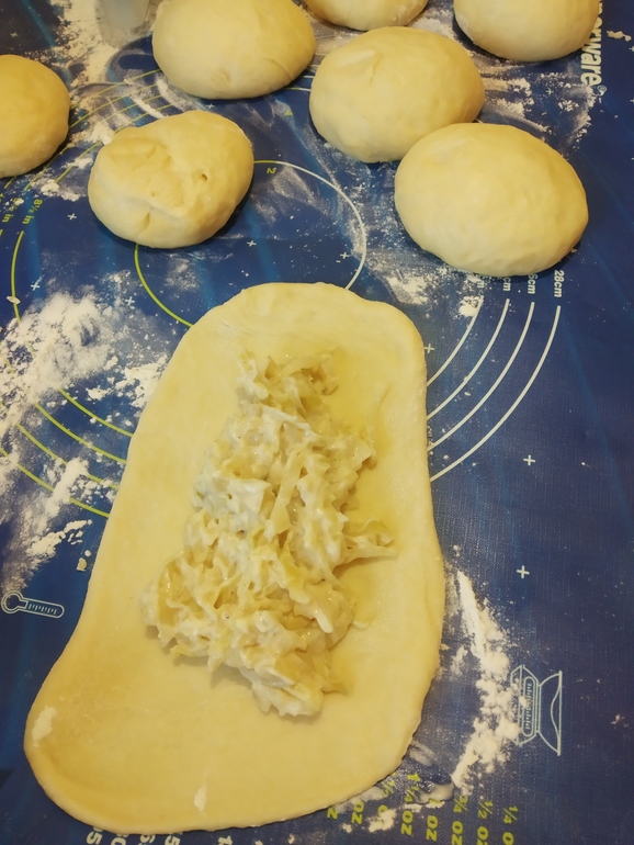 Каждую часть теста раскатать в овал. По центру каждого овала выложить начинку и защипнуть края теста, чтобы начинка была внутри теста.