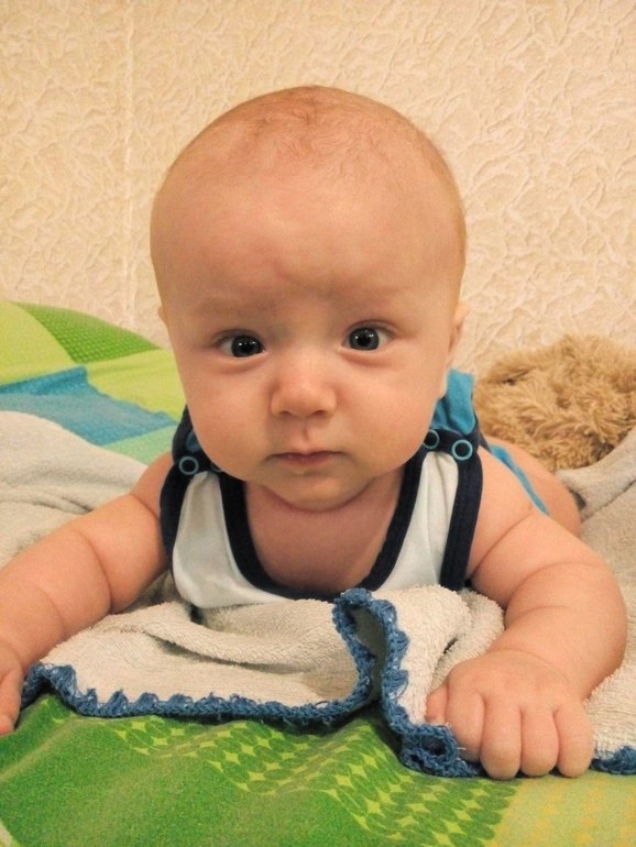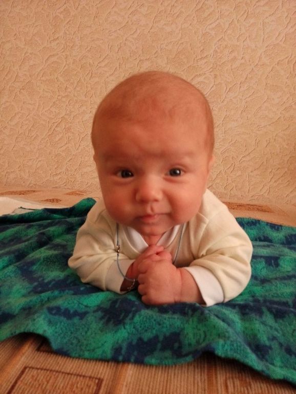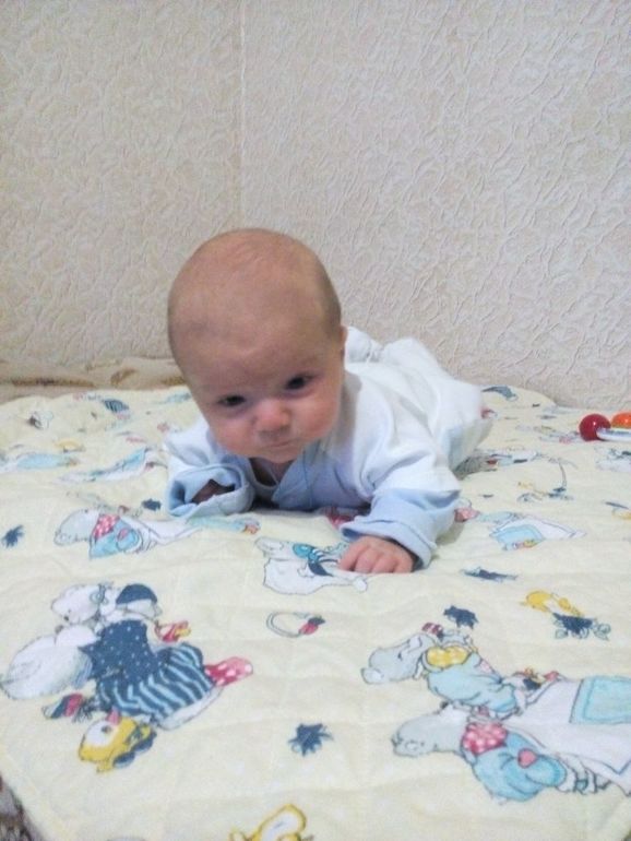 зато не пытается даже перевернуться, ни в какую, орет чтобы его на руки взяли, не знаю как быть( На животике пытается ползти, но получается только вертерься на животике как стрелка от часов=))) Нашли у нас родовую травму: смещение шейных позвонков. двух( Пошли к мануальному, говорит пришли бы в первый месяц все бы вправил, а теперь это долгий процесс, придется походить годик к нему. Унего и затылок смещен вправо, пока его не поставить наместо, озвонки бесполезно пытаться поставить наместо, он пытается, но каждый раз они уезжают обратно.( Вот так то( А так по здоровью все хорошо, тонус не большой в теле только. Мальчик копия папа, гвоорят глаза только мои.