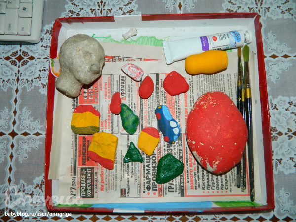 И еще разные камушки для росписи и игр. Голова из папье - маше, еще в процессе лепки, для кукольного театра.
