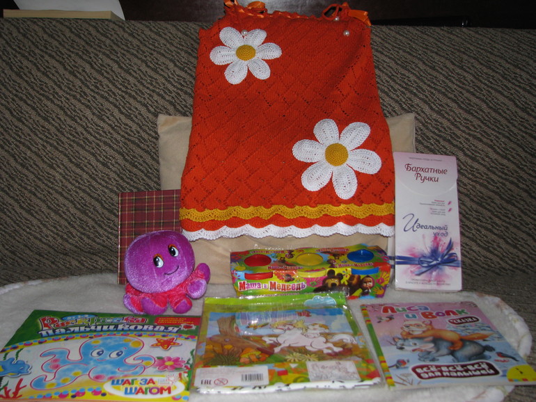 Для Никуси Анюта прислала пальчиковые краски,раскраску и обаятельного осьминога( теперь мы с ним спим - Ника все тащит к себе)))