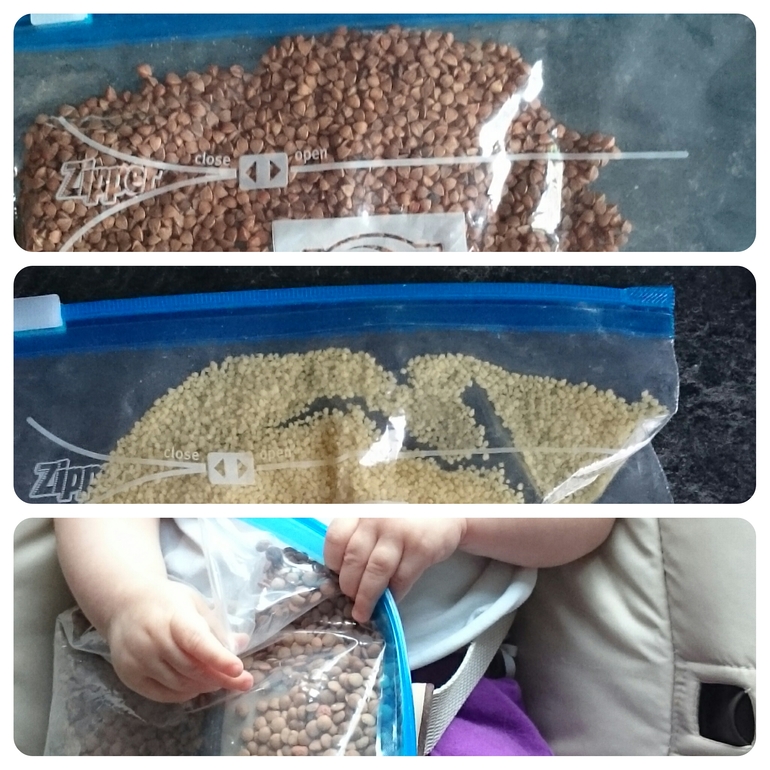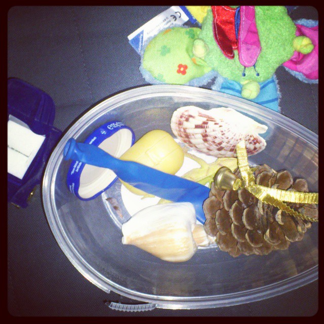 Ну это вобще хит. Это из рода:положи перед ребенком кучу игр и он выберет пакетик)) Единственная проблема:одного ребенка с этим не оставить,но как же интересно ковырять шишку,трогать перышко или стучать палочкой!