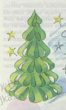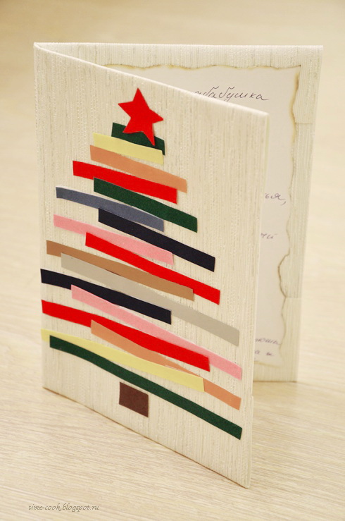 2. Отличный вариант применения полосок разных размеров - сделать из них открытку с елочкой. Резала Настя, клеили вместе.
